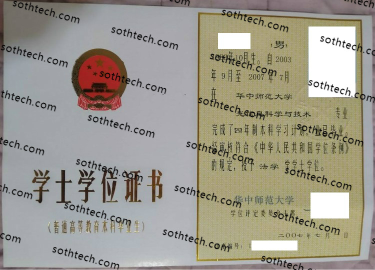 华中师范大学学士学位证书样本