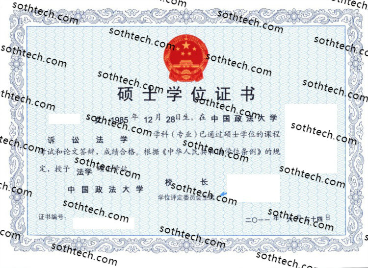 中国政法大学学士学位证书样本